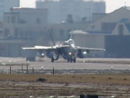 ちょーっと見にくいですが、CVW-5の戦闘機がズラリ並べられております。おそらく日本の基地で一番強力な航空団でしょう。 |
